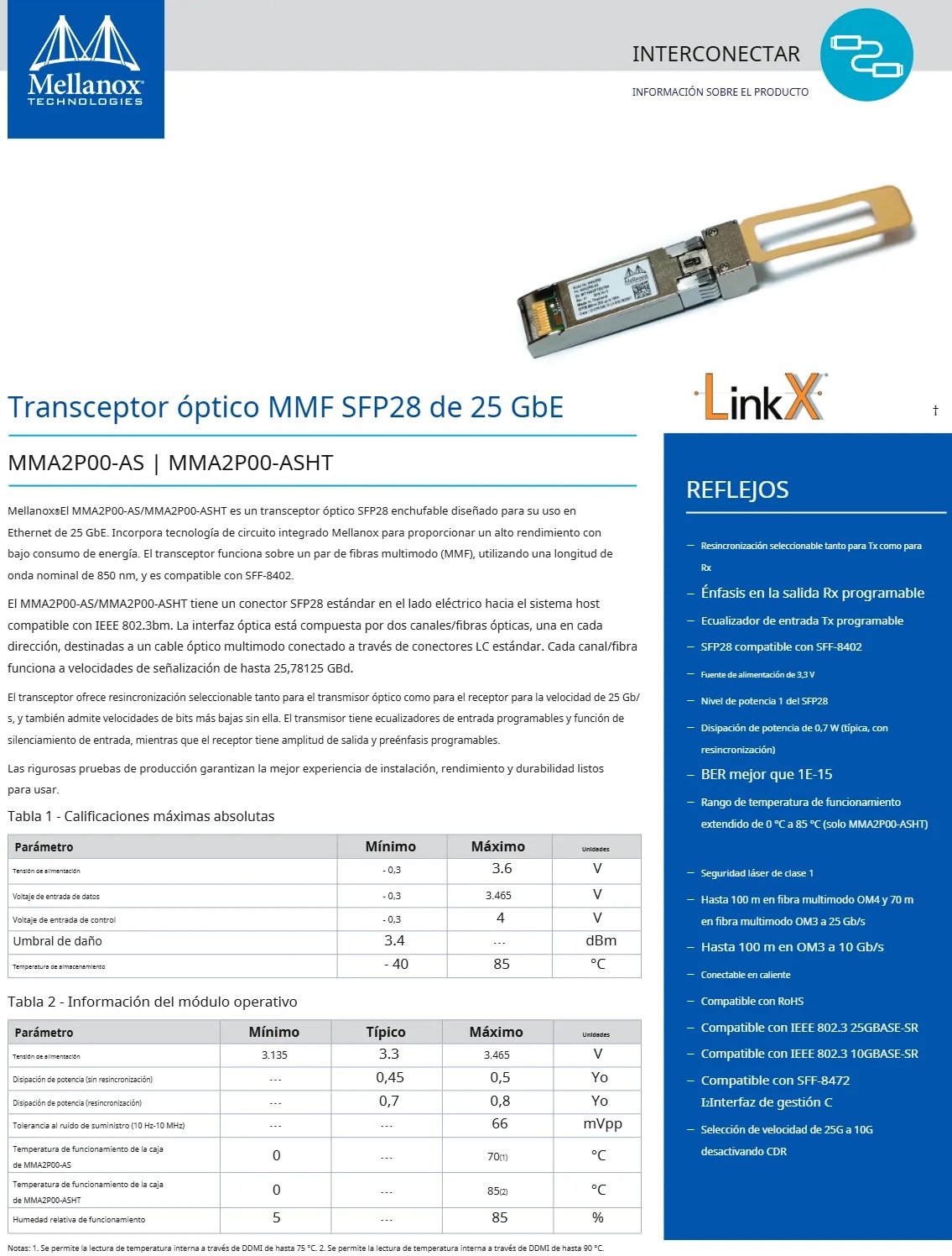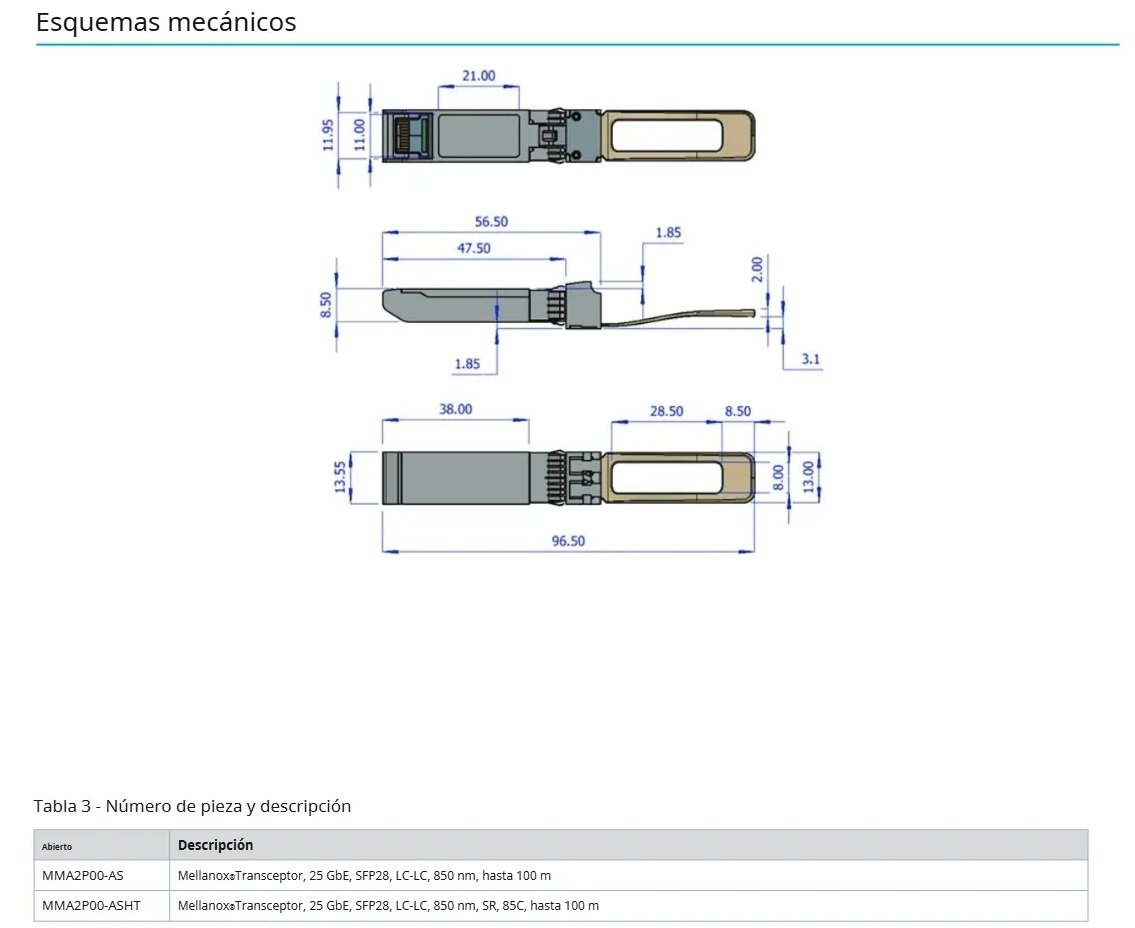 • El Mellanox MMA2P00-AS es un transceptor óptico SFP28 enchufable diseñado para su uso en Ethernet de 25 GbE.