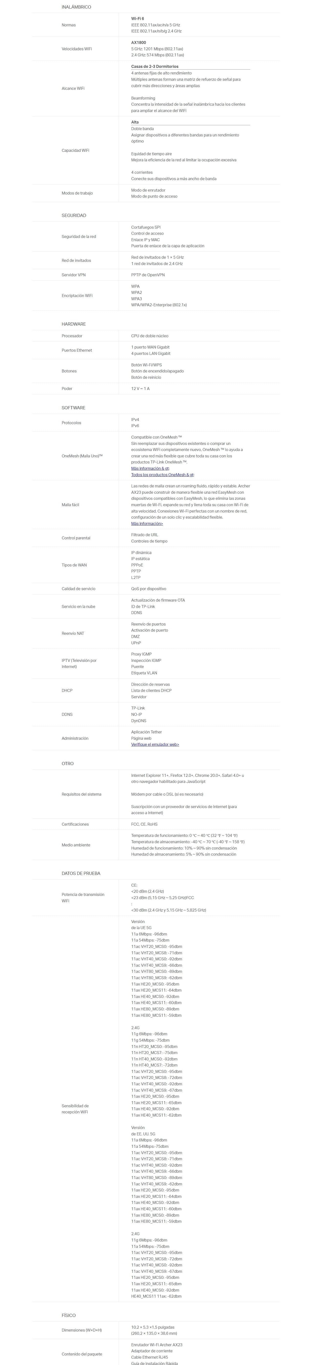 Router TP-LINK ARCHER AX23 / AX1800 / inalámbrico / 1201 Mbps / Doble Banda 2.4, 5 Ghz / 4 Puertos LAN / 4 Antenas / Color Negro