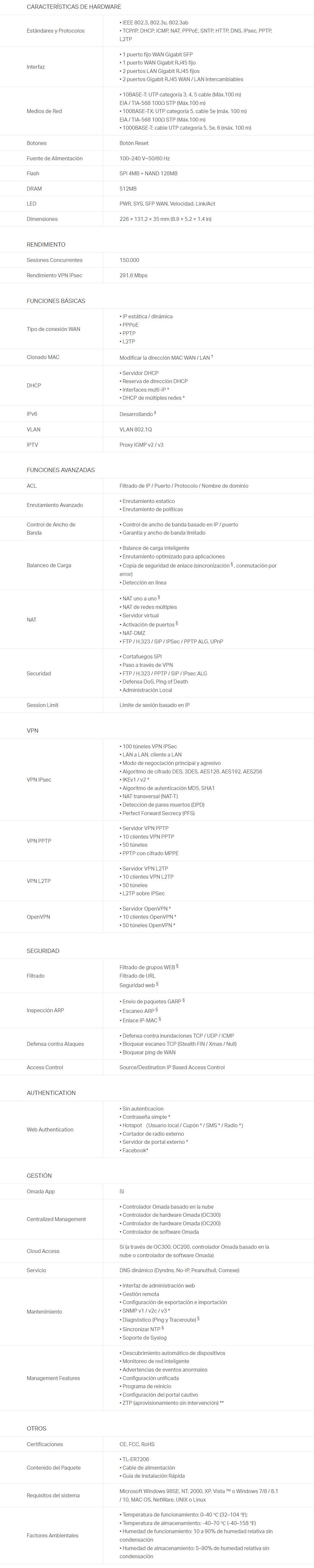 Router TP-LINK TL-ER7206 / Alámbrico / 5 Puertos / RJ-45 / 2 Puertos LAN, 1 Puerto WAN, 2 Puertos WAN/LAN / VPN, OpenVPN / Negro