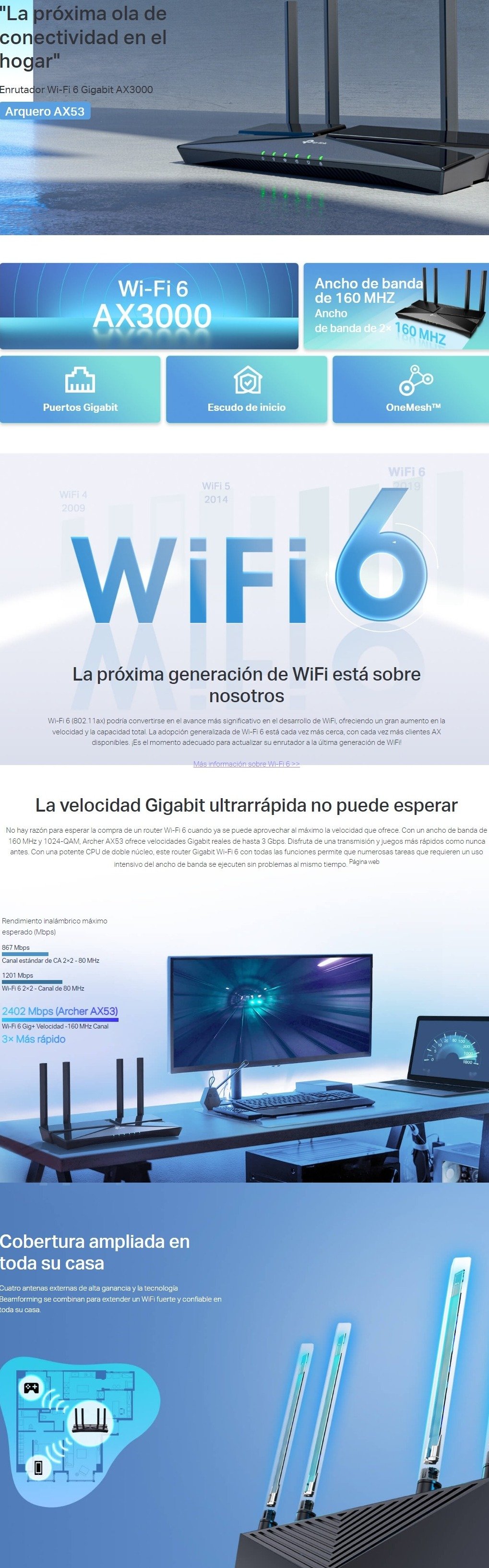 • Velocidad Gigabit Wi-Fi 6 de última generación: 2402 Mbps en 5 GHz y 574 Mbps en la banda de 2,4 GHz garantizan una transmisión más fluida y descargas más rápidas.