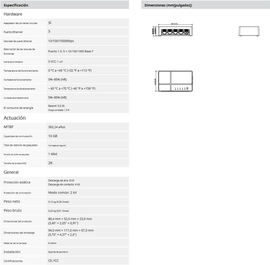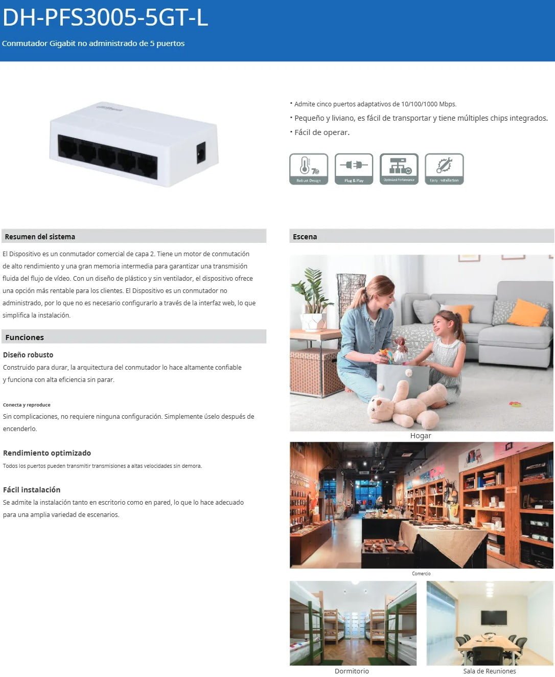 • El DAHUA PFS3005-5GT-L es un switch de escritorio compacto y eficiente que ofrece cinco puertos Gigabit Ethernet para una conectividad rápida y estable en pequeñas oficinas y hogares