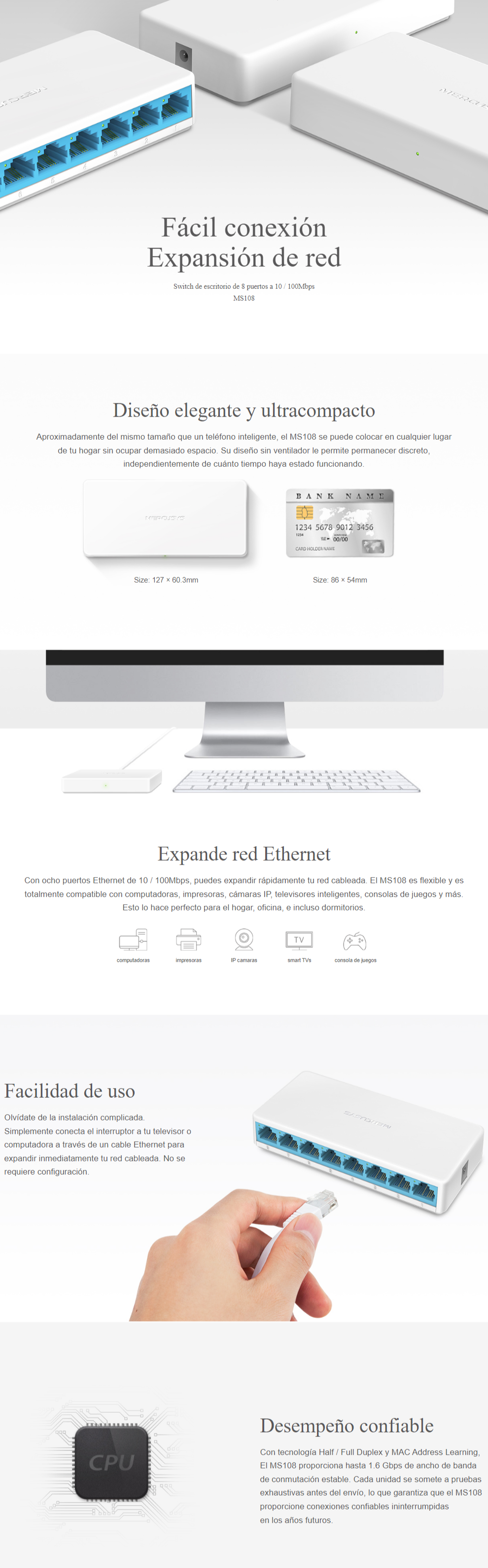 Switch Mercusys Ms108 / 8 Puertos / 10/100MBPS / 1.6 Gbit/S / Blanco