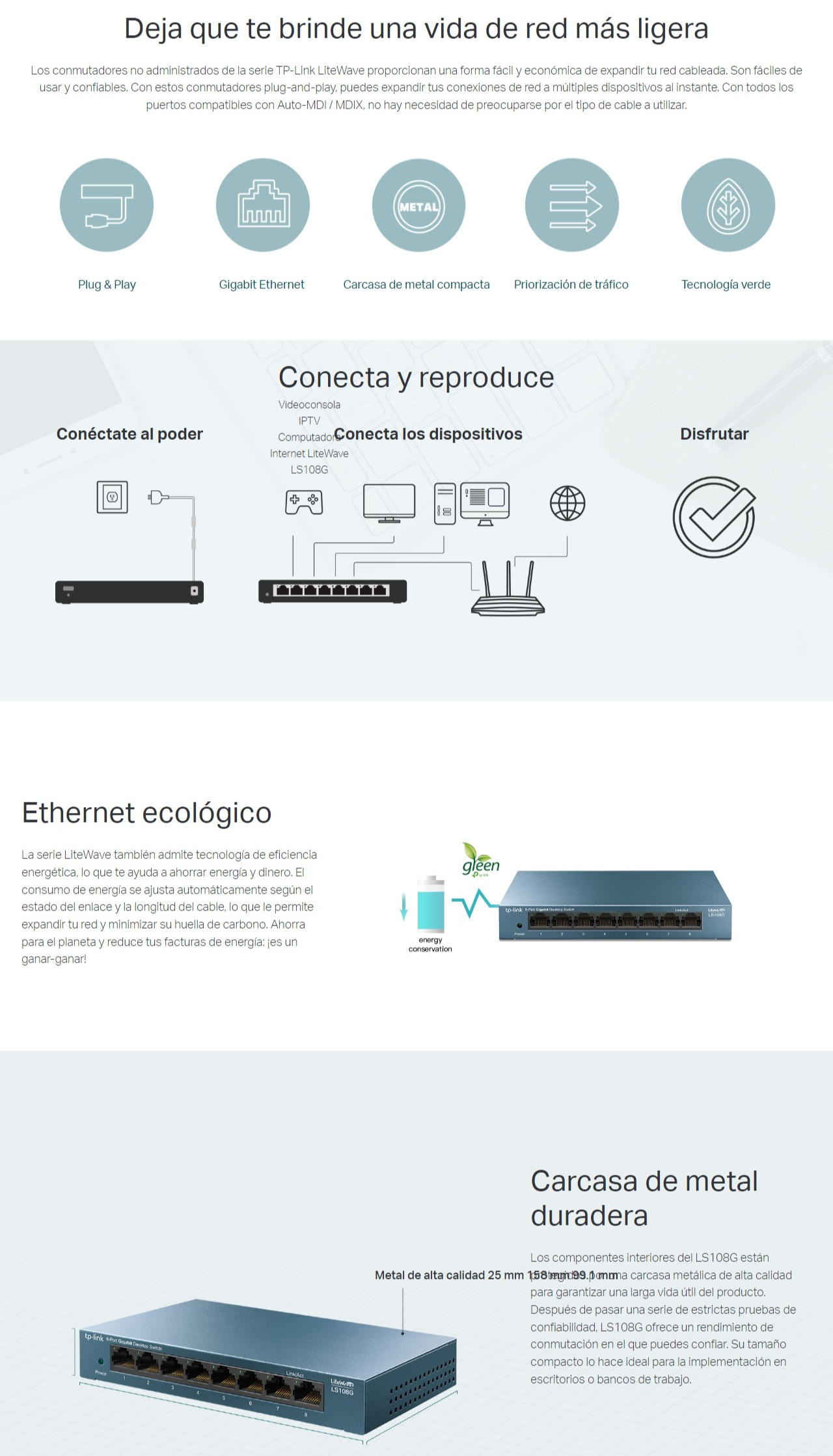 Switch TP-Link LS108G / 8 Puertos RJ45 10/100/1000Mbps / No Administrable / Tasa De Reenvió De Paquetes 11.9Mbps / Carcasa Metálica / Gris