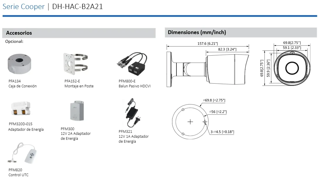 • La cámara modelo COOPER B2A21 es una cámara Metálica con tecnología HDCVI, proporciona vídeo en alta definición a una resolución de 1080p (1920 x 1080), incorpora un lente fijo de 3.6 mm el cual proporciona un ángulo de visión de 93 grados. Cuenta con DWDR, Smart IR con un alcance de 20 metros, menú OSD y además la cámara cuenta con un índice de protección IP67 por lo que goza de una protección contra el polvo y agua.