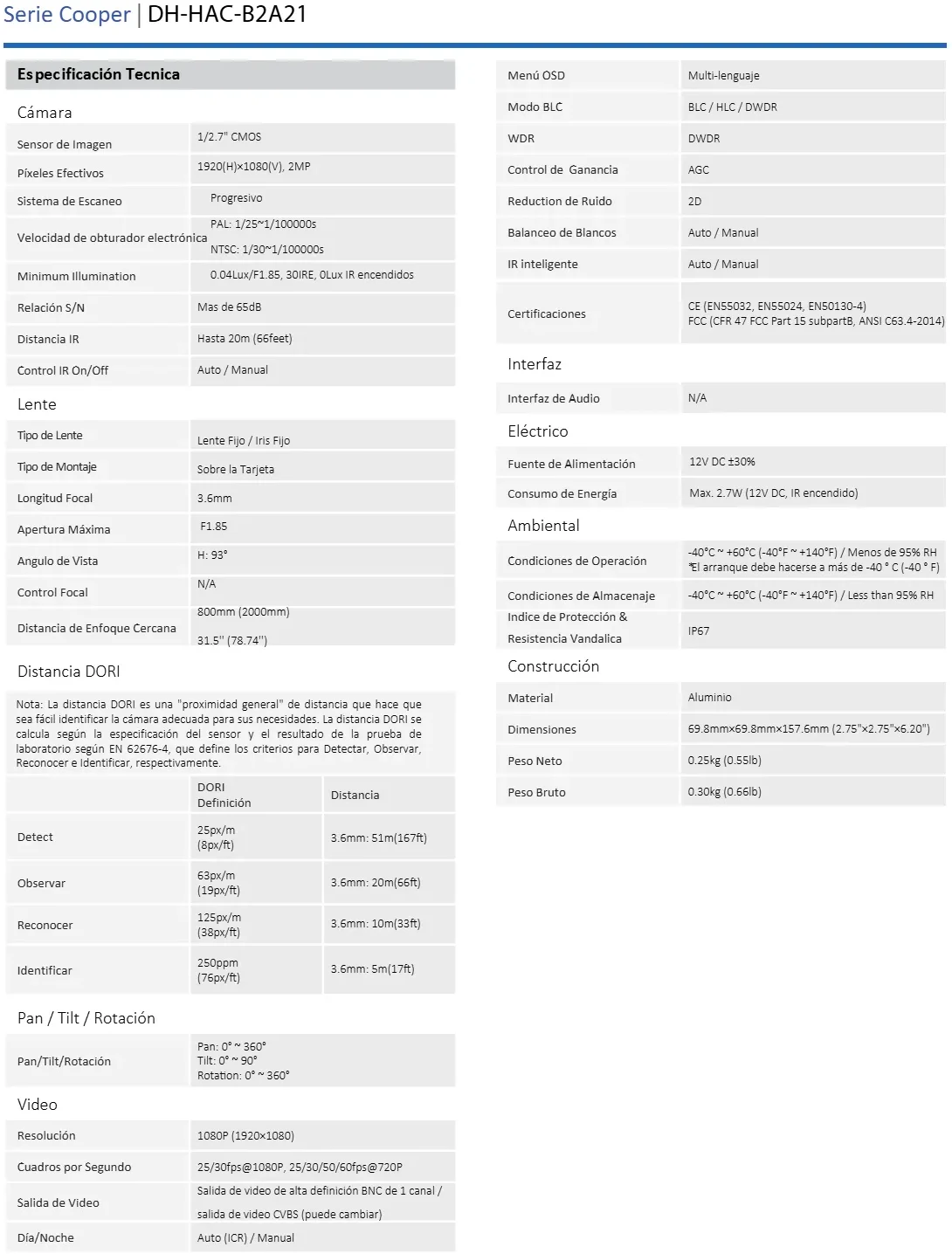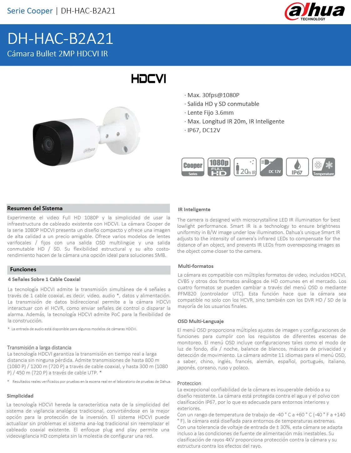 • La cámara modelo COOPER B2A21 es una cámara Metálica con tecnología HDCVI, proporciona vídeo en alta definición a una resolución de 1080p (1920 x 1080), incorpora un lente fijo de 3.6 mm el cual proporciona un ángulo de visión de 93 grados. Cuenta con DWDR, Smart IR con un alcance de 20 metros, menú OSD y además la cámara cuenta con un índice de protección IP67 por lo que goza de una protección contra el polvo y agua.