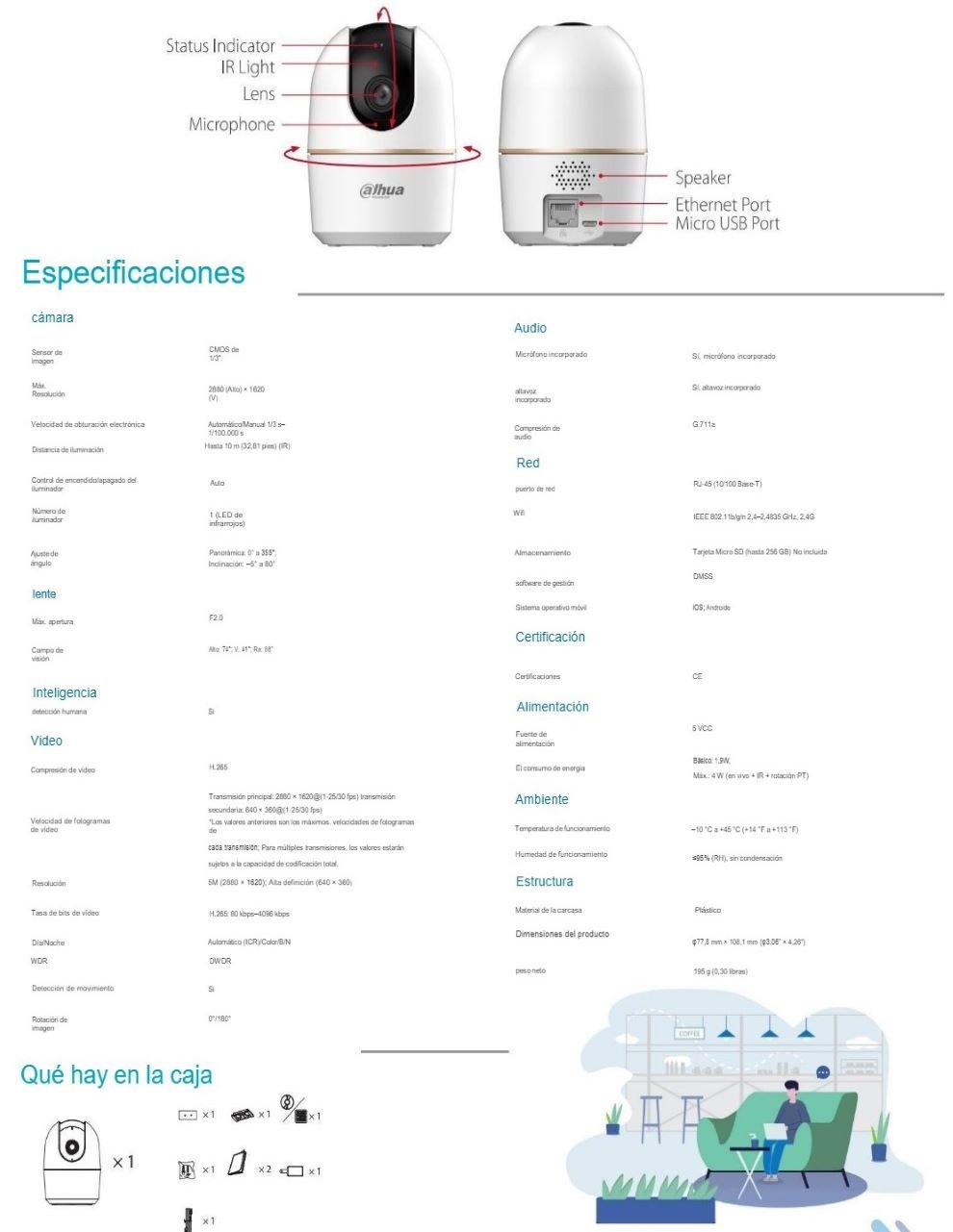 Cámara De Vigilancia DAHUA Domo / 5Mp / Ir De Luz 10Mts / Con Micrófono / Detección Humana Por IA / Tarjeta Micro SD Hasta 256 GB / Para Interior / Color Blanco