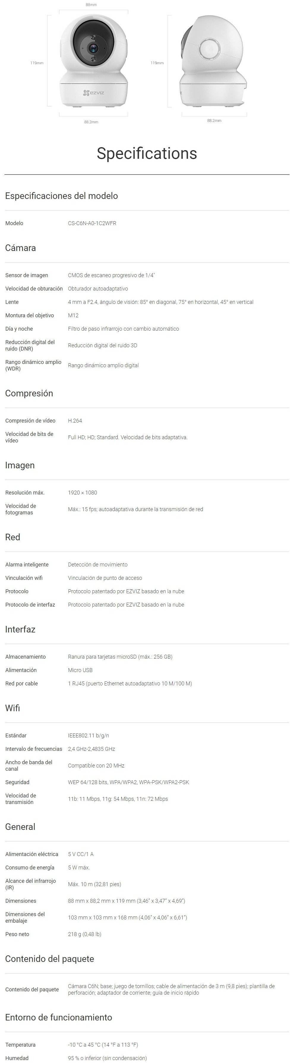 Cámara De Vigilancia EZVIZ C6N Domo / 2Mp / Micrófono Integrado / Lente De 4mm / H.264 / Ir De 10Mts / Micro SD / Para Interior / Blanco