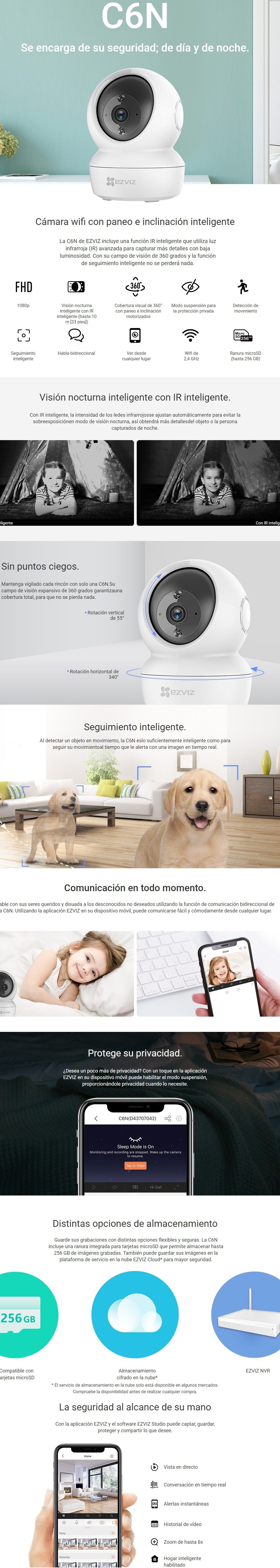 La C6N de EZVIZ incluye una función IR inteligente que utiliza luz infrarroja (IR) avanzada para capturar más detalles con baja luminosidad. Con su campo de visión de 360 grados y la función de seguimiento inteligente no se perderá nada.