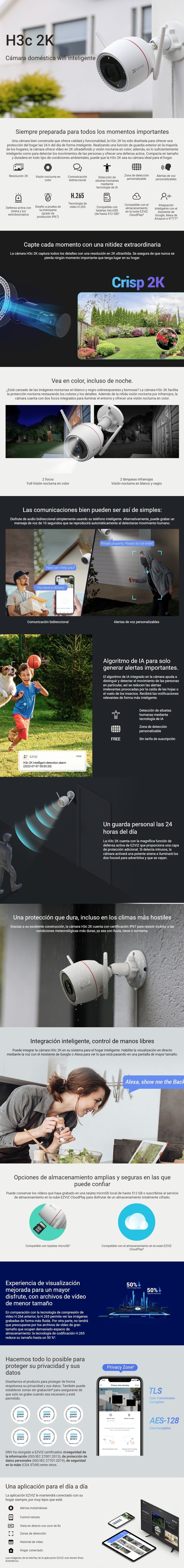 Cámara De Vigilancia EZVIZ H3c 2K / 3Mp / 2304X1296 Pixeles / Micrófono Integrado / Bocina / Color / IR Luz Blanca 30Mts / IP 67 / Seguimiento Dinámico / SD Hasta 512 GB / Para Interior Y Exterior / Blanco