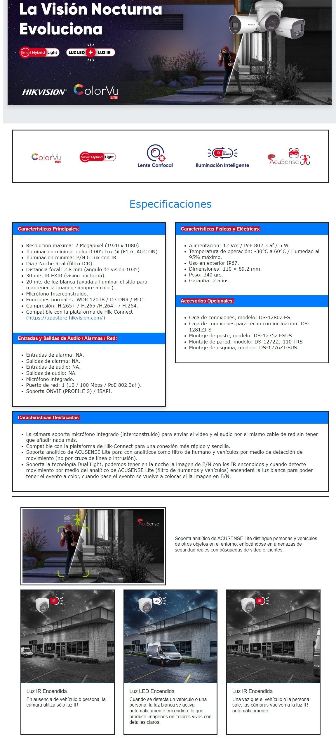 Cámara De Vigilancia HIKVISION Domo / Color Vu / 2Mp / Acusense / Micrófono Integrado / Lente De 2.8mm / Luz Blanca 20Mts / Para Exterior IP67 / Blanco