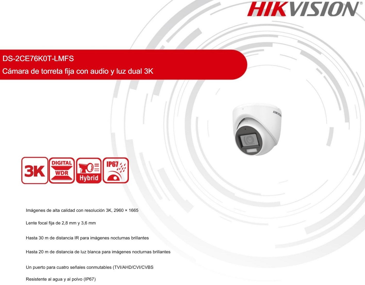Cámara De Vigilancia HIKVISION DS-2CE76K0T-LMFS / 2K / 2960X1665 Pixeles / IR 30 M / Visión Nocturna / IP67 / DualLight / Micrófono / Blanco
