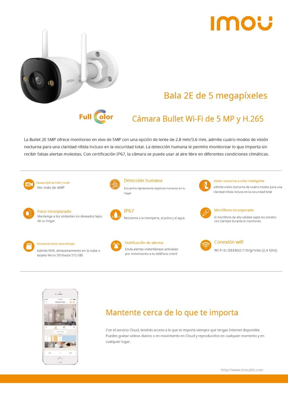 Cámara De Vigilancia IMOU Bala 2e / 5Mp / Full Color / H.265 / Lente 2.8mm, 3.6mm / Visión Nocturna 30 M / Micrófono / Detección Humana / Para Exterior IP67 / SD Hasta 512 GB / Blanco