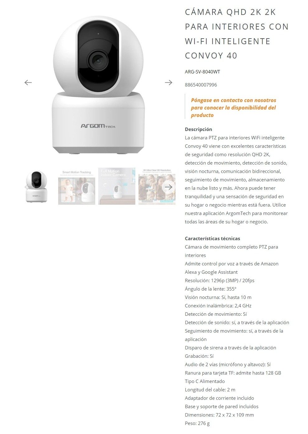 Sé el primero en valorar “Cámara De Vigilancia IP ARGOMTECH Convoy 40 / 3Mp / 1296P / Detección De Movimiento / Visión Nocturna 10Mts / Ranura Para Tarjeta TF 128 GB / Para Interior / Color Blanco”
