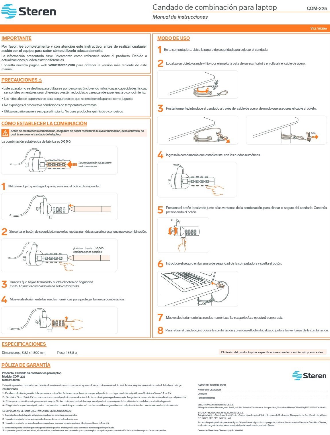 • El cable está fabricado con acero cubierto de plástico flexible que tiene tratamiento especial para hacerlo altamente resistente al corte. Se abre por medio de combinaciones numéricas (hasta 10,000 posibles), por lo que es muy seguro.