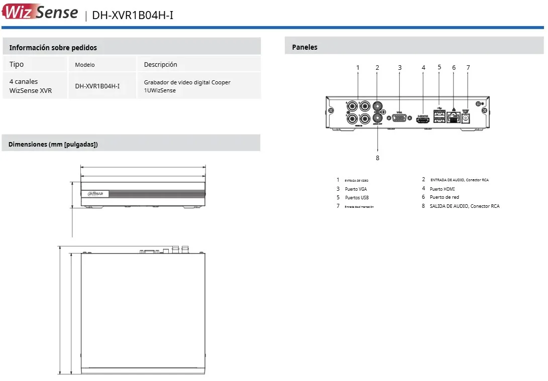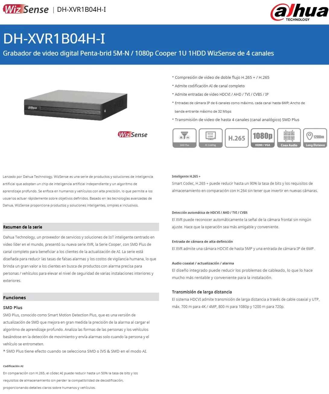 DVR DAHUA XVR1B04H-I / 4 Canales / 1080p / 5Mp Lite / WizSense / H265+ / 4 Canales+2 IP O Hasta 6 Canales IP / SMD Plus / Negro