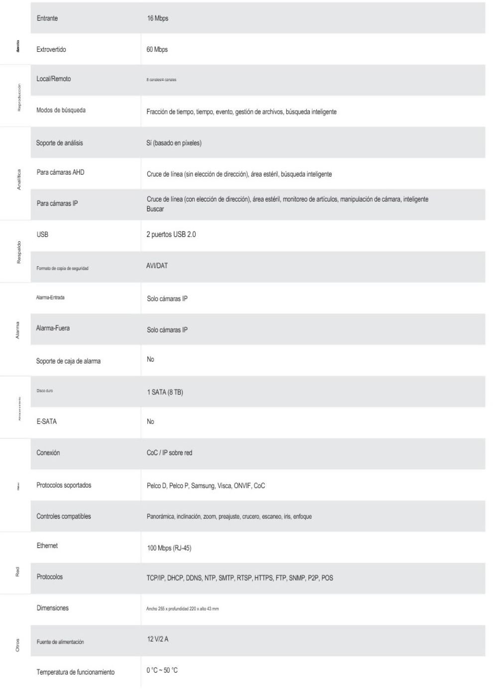 El DVR de 8 Canales + 2 Canales SH-8100A5S-2L(MM) de Provision-ISR es un dispositivo con una anchura de 255 mm. Tiene una velocidad de captura de vídeo (PAL) de 30 fps y funciona con una tensión CC de 12 V.