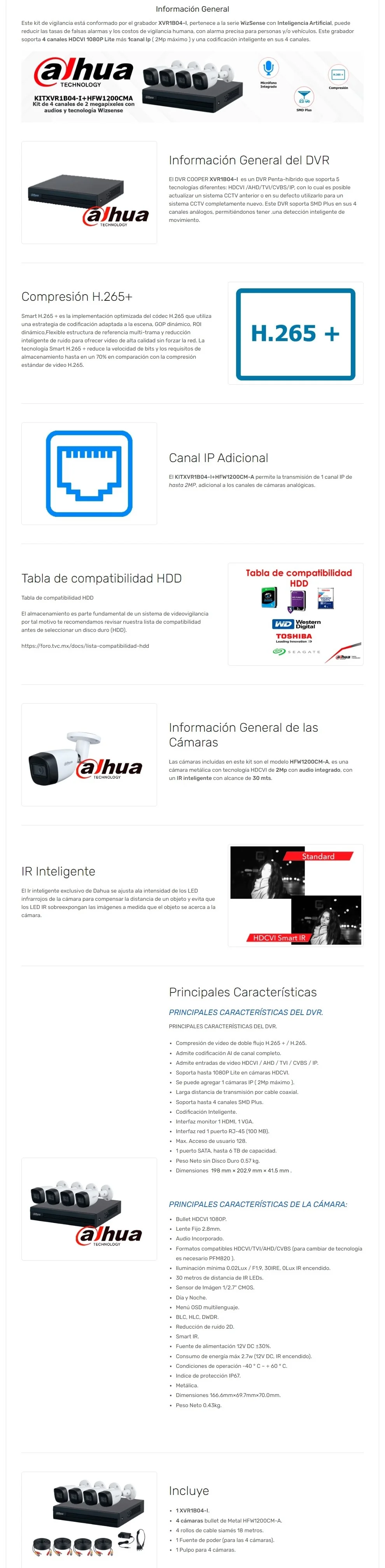 Kit de 4 Cámaras Metálicas de 2 Megapíxeles Con Audio DAHUA / DVR Cooper-I WizSense Con IA H.265+ / 4 Ch+ 1 IP o Hasta 5 Ch IP/ 4 Ch SMD Plus