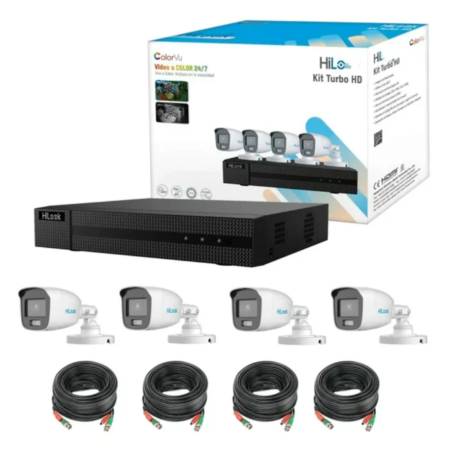 Kit De Videovigilancia HILOOK Turbo HD / 2MP / 1920x1080P DVR 4 Canales / 4 Cámaras Tipo Bala / ColorVu / Micrófono Integrado / Inc. Fuente De Poder / Blanco
