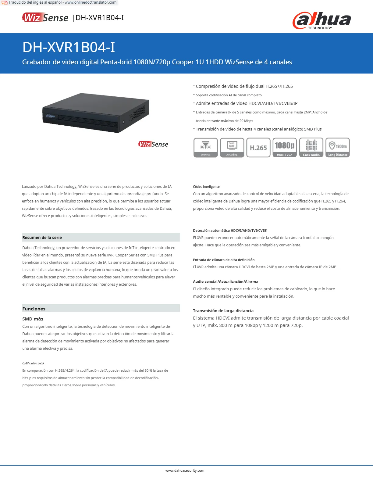 • Soporta hasta 1080P Lite en cámaras HDCVI.
