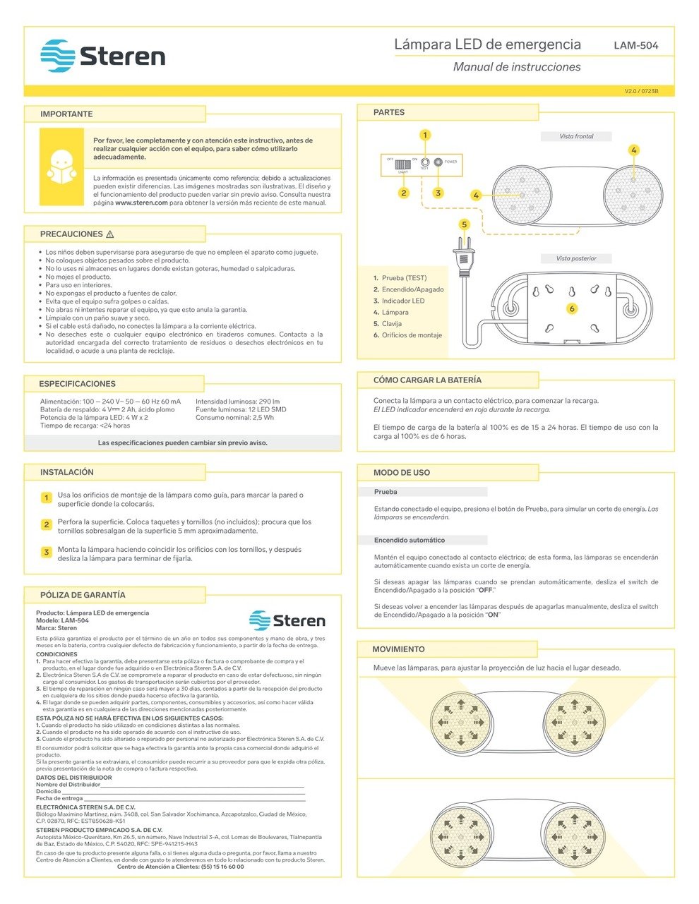 Lampara De Emergencia STEREN LAM-504 / LED / 12 LEDs / Hasta 6 Horas De Uso / Para Apagones / Luces Direccionables / 290 Lúmenes / Color Blanco