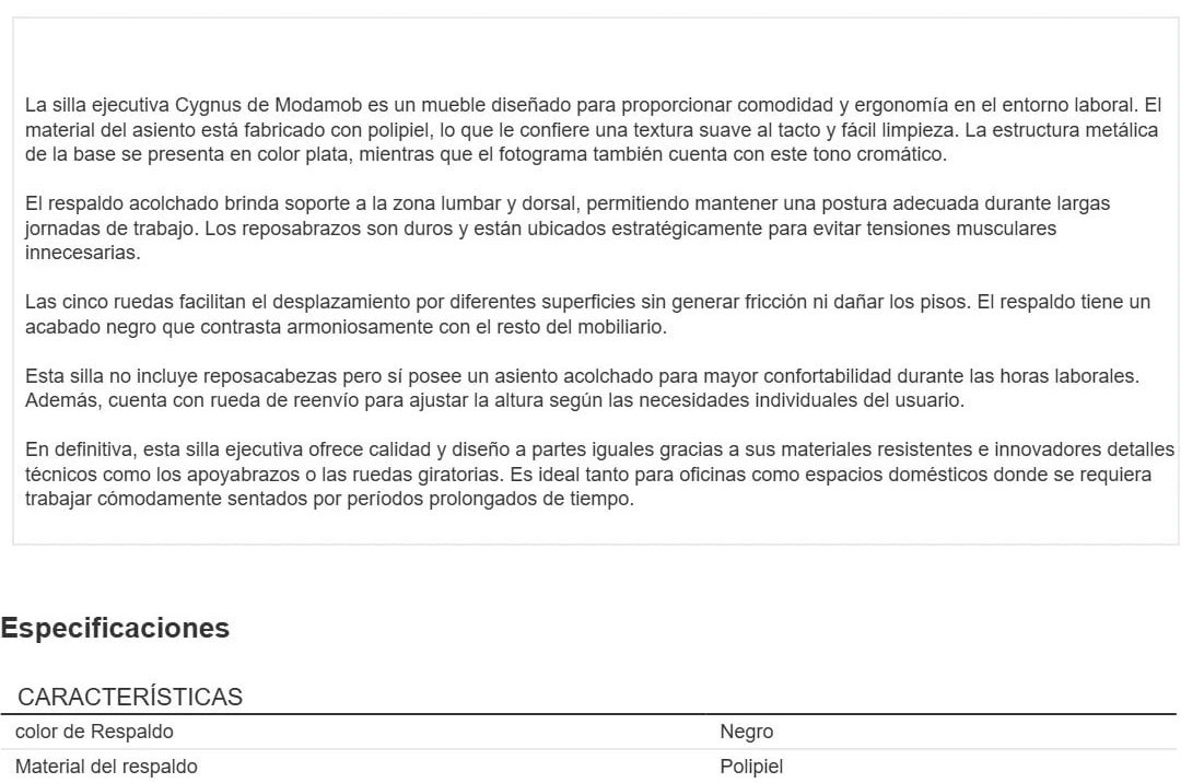 Silla Ejecutiva MODAMOB CYGNUS / Vini Piel / Pistón De Altura / Reposabrazos / Base Metálica / Con 5 Ruedas / Negro-Plata