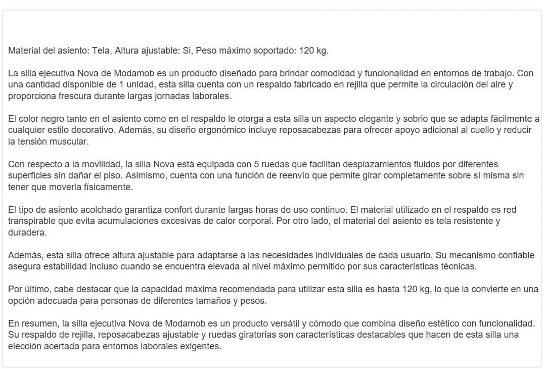 • La silla ejecutiva Nova de Modamob es un producto diseñado para brindar comodidad y funcionalidad en entornos de trabajo.