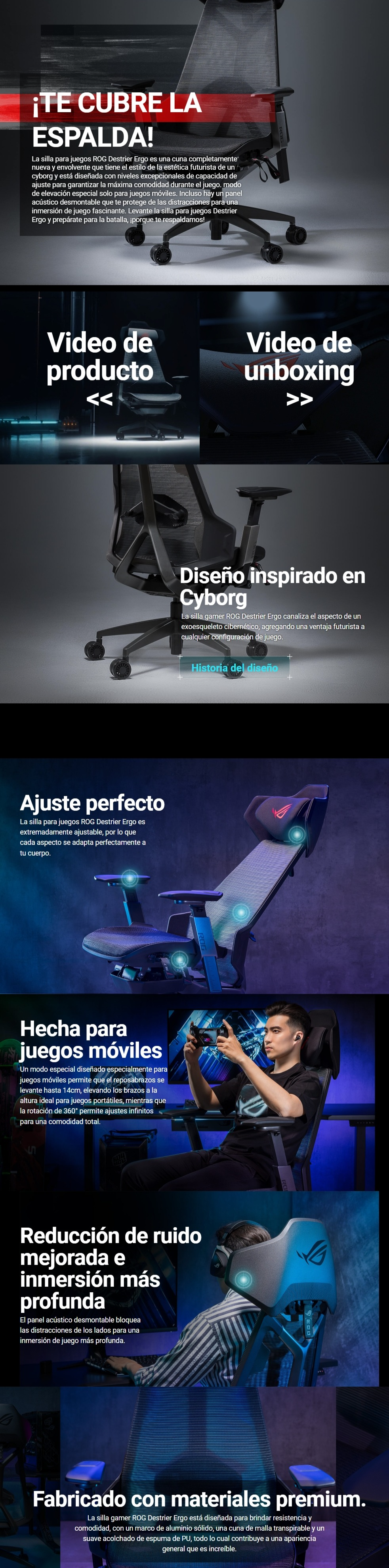 • Menos ruido, inmersión más profunda: La silla para juegos ROG Destrier Ergo con estética cyborg futurista, ajustes de asiento versátiles para una postura perfecta, modo de soporte de brazo para juegos móviles y panel acústico para menos distracciones y mayor profundidad inmersión en el juego.