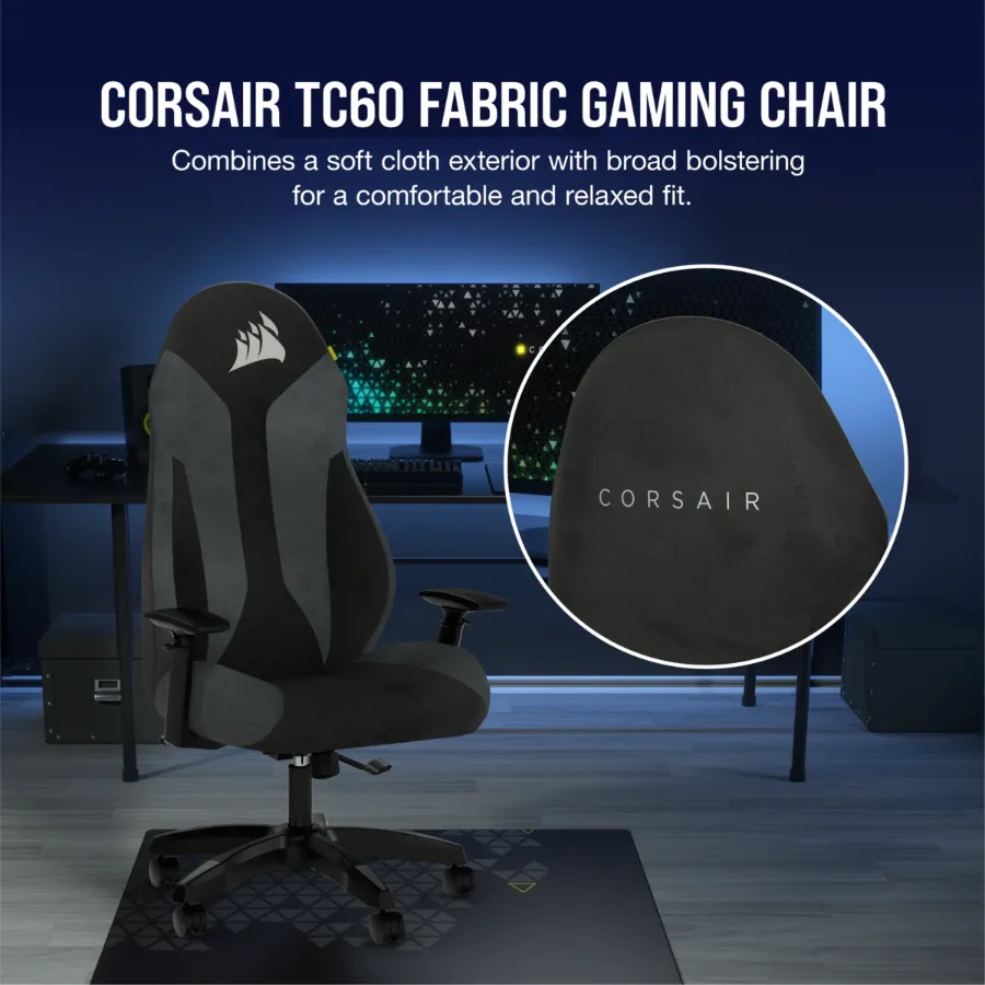 Silla Gamer Corsair TC60 / Tela Suave / Relax Fit / Hasta 120kg / Reposa Brazos / Negro-Gris