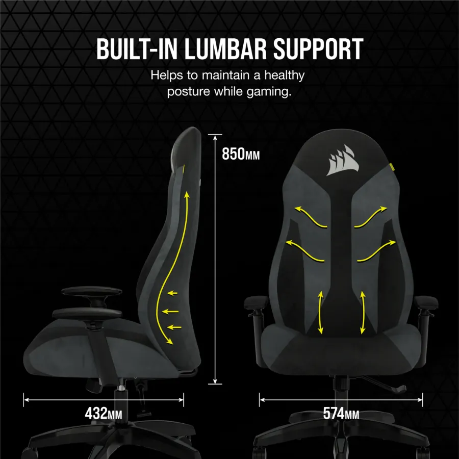 Siéntase en el punto de mira de sus rivales con la silla para juegos CORSAIR TC60 FABRIC, que combina un exterior de tela transpirable con un amplio respaldo para disfrutar de comodidad y relax.