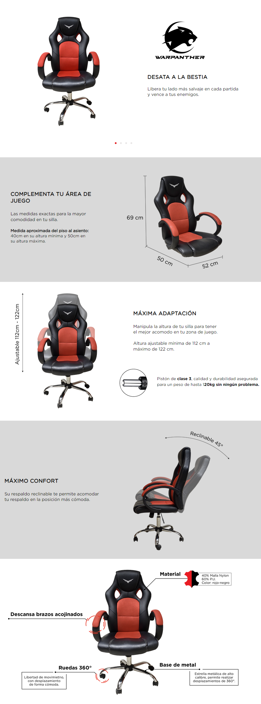 Silla Gamer NACEB WARPANTHER / Reclinable 45° / Descansabrazos / Pistón de clase 3 / Negro Con Rojo