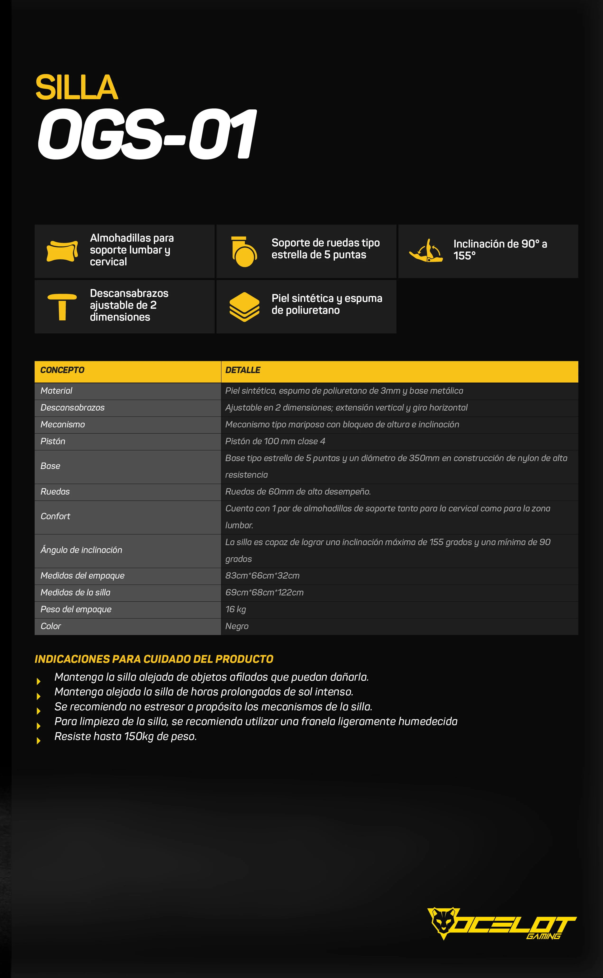Silla Gamer OCELOT OGS-01 / Descansa Brazos 2D Ajustables / Reclinable 90°-155° / Soporta Hasta 150KG / Cojín Lumbar Y Cervical / Color Negro