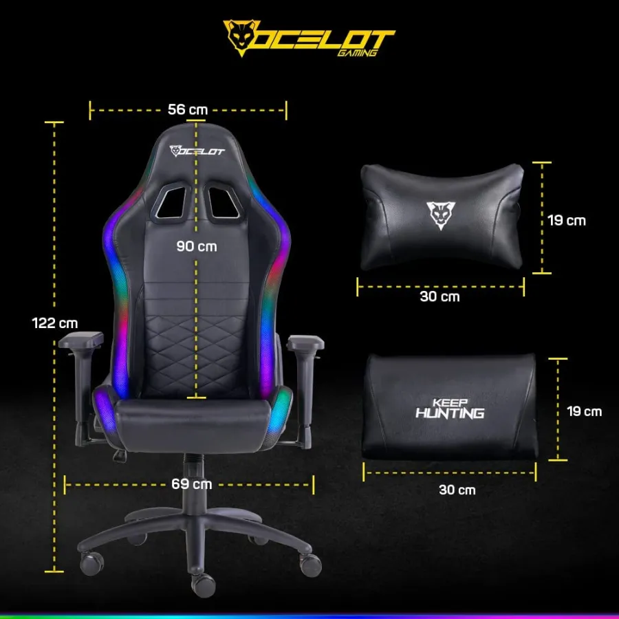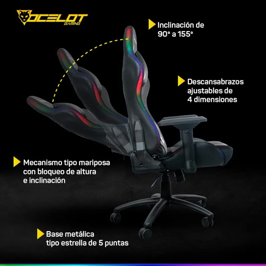 Silla Gamer OCELOT OSRGB RGB / Base De Metal / Descansa Brazos Ajustables / 155° De Inclinación / Hasta 150Kg / Negro / OSRGB