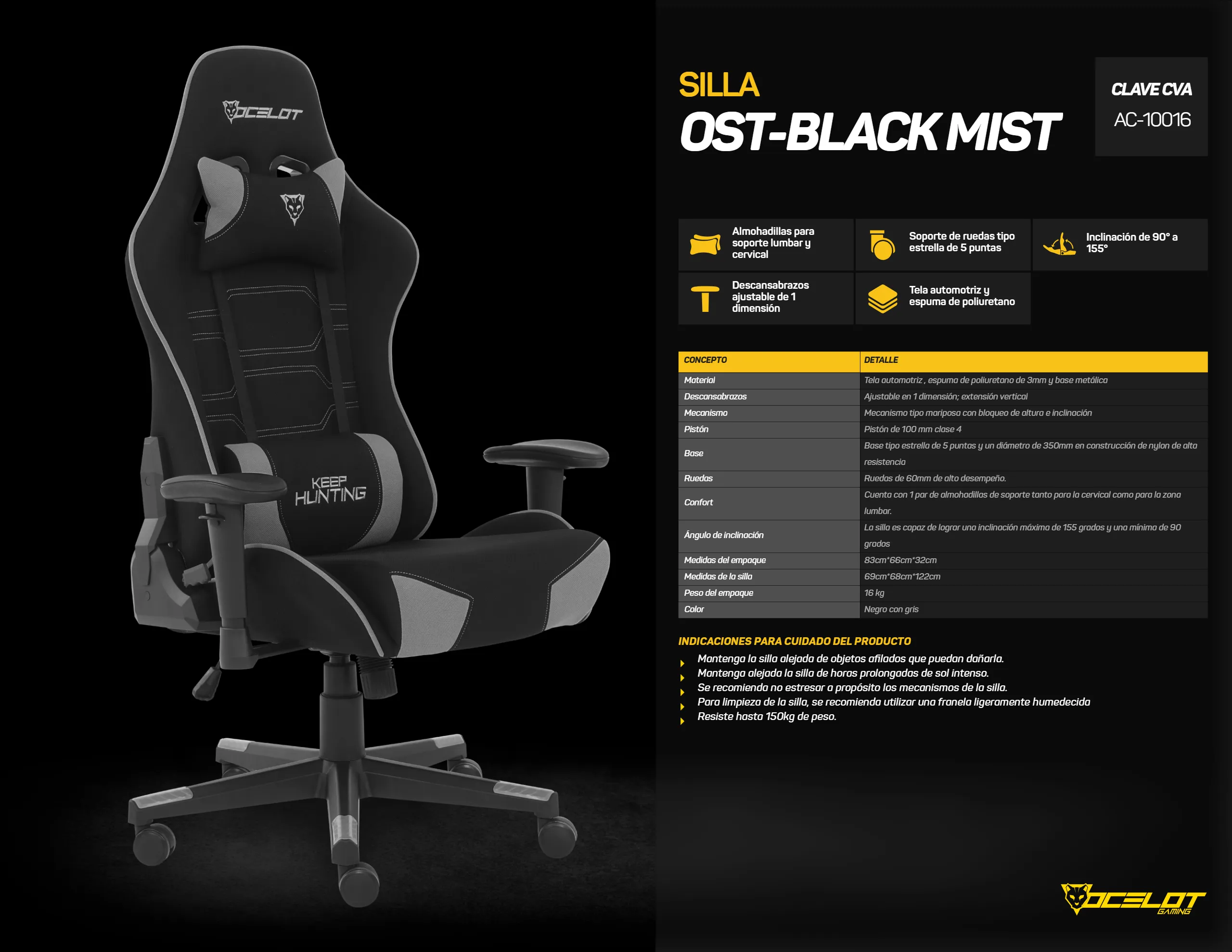 Sé el primero en valorar “Silla Gamer OCELOT OST-BLACK MIST / Descansa Brazos Ajustables / 155° De Inclinación / Hasta 150Kg / Base hidraulica / Negro Con Gris / OST-BLACK MIST”