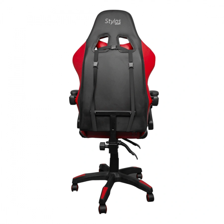Silla Gaming STYLOS SGSI02R / Pistón Clase 3 / Brazos Ajustables / Respaldo / Inclinación Hasta 150° / Hasta 115KG / PVC Alto Desempeño / Negro-Rojo