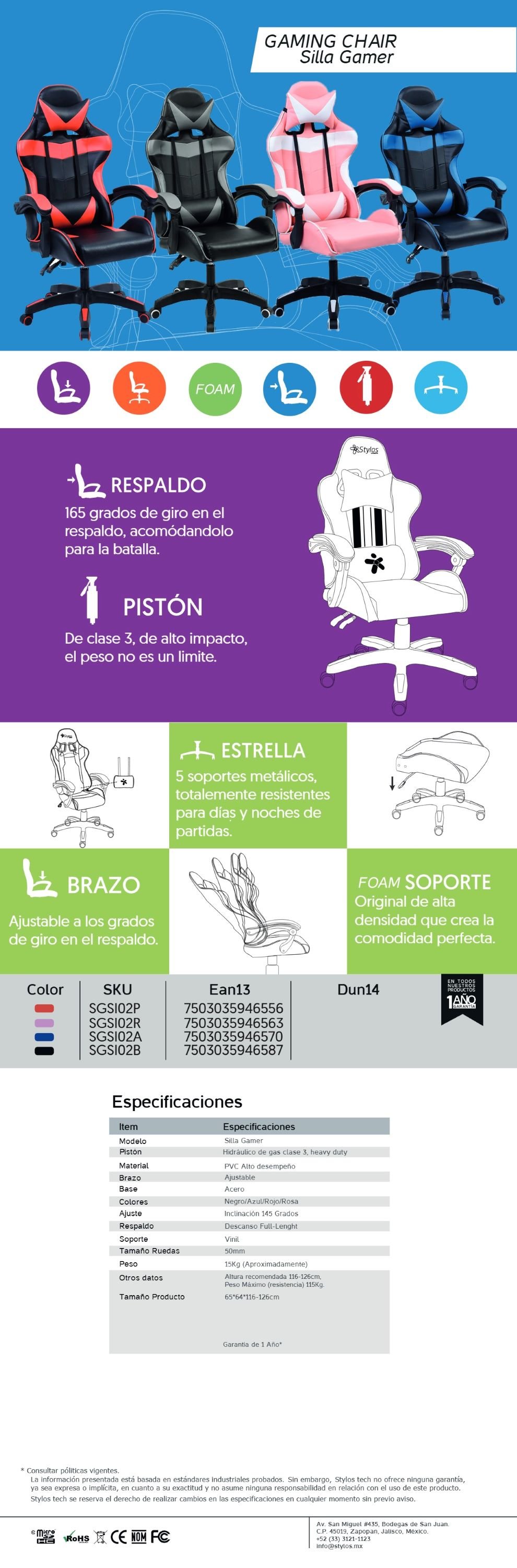 La silla gamer STYLOS TECH SGSI02 es un producto diseñado para brindar comodidad y ergonomía a los usuarios que pasan largas horas frente al ordenador. Con una capacidad de peso máximo de 115 kg, esta silla cuenta con reposabrazos ajustables y respaldo acolchado en color negro y rojo.