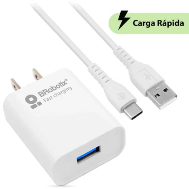 Combo Carga Rápida BROBOTIX 6001318 – Cargador USB V3.0 + Cable USB Tipo-C de 1mtr – Color Blanco
