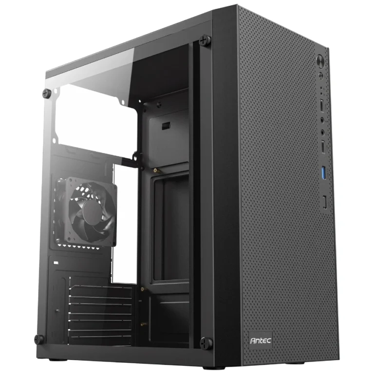 Gabinete Mini Torre Antec ST10M TG – Micro-ATX/ITX, Panel Lateral de Vidrio Templado, 1 Ventilador 80mm Preinstalado – Negro