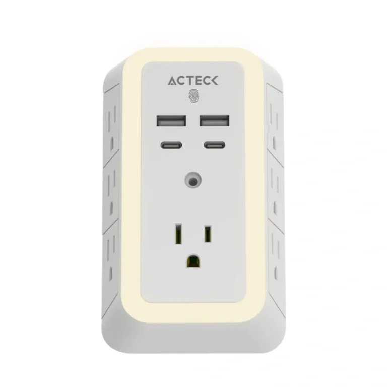 Cargador De Pared ACTECK Energon Lumina CP515 / X7 Tomacorriente / X2 USB / X2 USB-C / LED / Sensor Touch / Resistente Al Fuego / Blanco